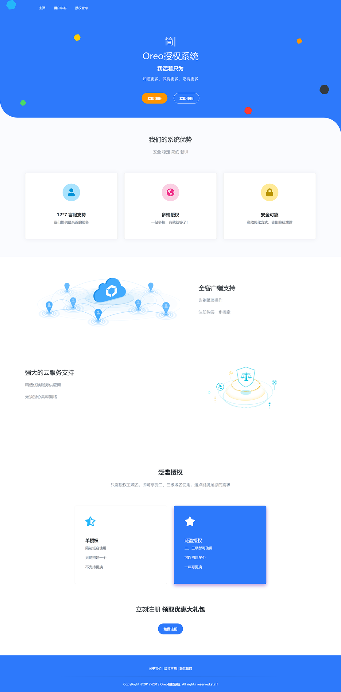 Oreo域名授权验证系统v1.0.6公益开源版本网站源码几乎所有的程序都能整合使用,包括您的app和计算机程序,支持多程序授权、在线支付、权限分配、内测用户、在线升级、商业广告、工单系统、盗版管理、自定义用户等级、自定义授权提示、授权程序、到期时间设置、IP验证、版本验证、IP域名双重验证、单域名验证、泛域名验证、余额卡密、授权卡密、授权过户、上下级关系、远程静态资源、多用户注册、在线授权、权限升级、补差价升级等功能。